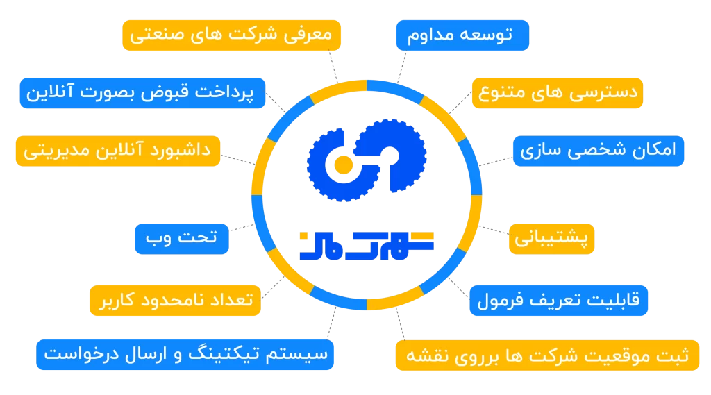 سامانه دارای پنل مدیریت کامل شامل امکاناتی مانند ثبت پروفایل دقیق واحدهای صنعتی (۸۵ فیلد اطلاعاتی)، بارگذاری امضا و قرارداد الکترونیکی، ثبت اطلاعات پرسنلی، تماس، تاریخچه تغییرات و پیامک‌های ارسالی است.