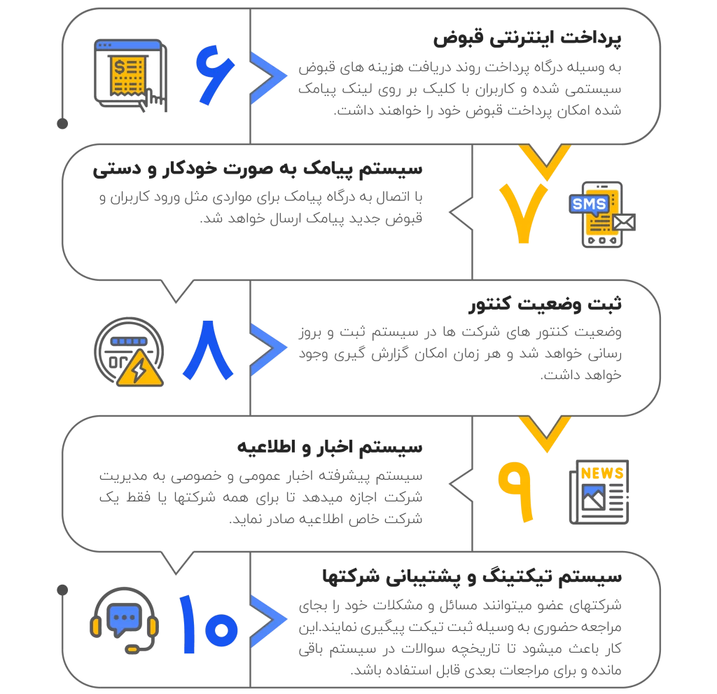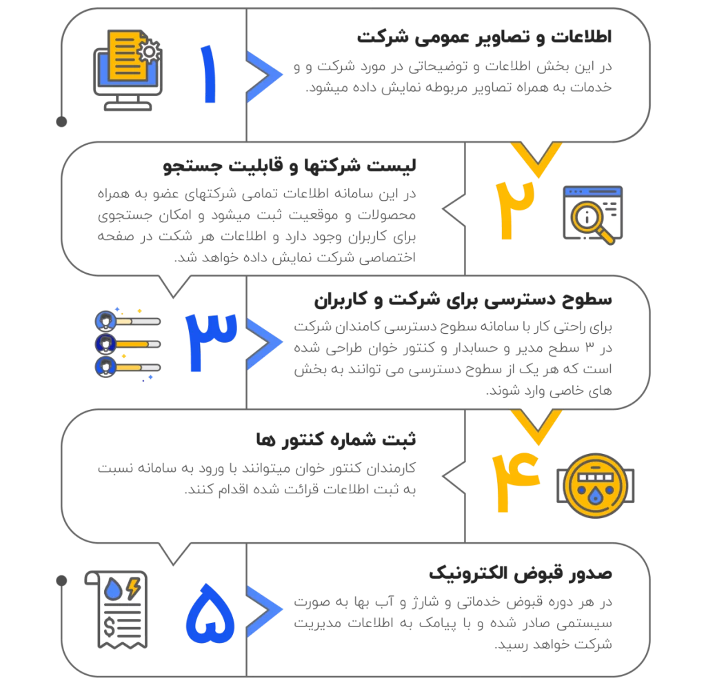 سامانه تمام فرایندهای ارتباطی با مشترکین را پوشش می‌دهد—از صدور قبوض تا تسهیل اخذ مجوز خروج و مدیریت تعاملات مالی و غیرمالی.